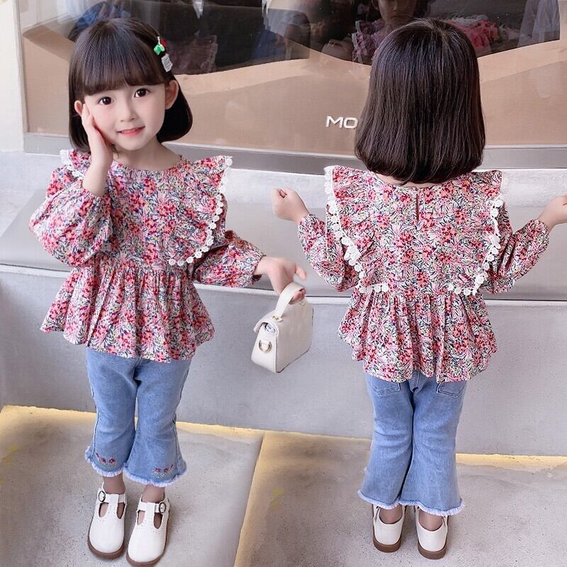 大人気 子ども服 セットアップ 花柄 ブラウス ジーンズ パンツ かわいい 韓国